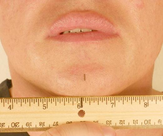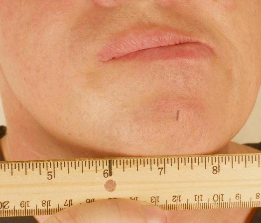 Please notice that during lateral movement to the left, the marked point on the chin moved more than an inch along the ruler, while during lateral movement to the right, the patient was able to move the lower jaw only slightly because he felt pain in the left TMJ.