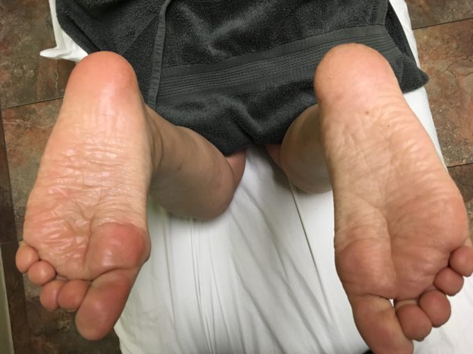 The patient was given homework (passive stretches, Dr. Scholtz’s Gel inserts, avoidance of flip flops and barefoot walking at home, daily foot bath in hot water with a lot of Epson Salt to hypertonic solution). She came back in two days with no symptoms of Plantar Fasciitis. We observed her for two months since she chooses to have monthly supportive Medical Massage sessions to prevent her lower back pain. She hasn’t had any complaints since.
