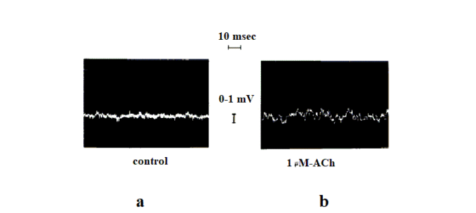Normally this ACh leakage is small and it doesn’t trigger full muscle contraction, but rather produces miniature end plate potentials called Postsynaptic Noise and this noise can be registered by recording equipment in a completely relaxed muscle. Fig. 3a illustrates the presence of low voltage end plate potentials in the relaxed latissimus dorsi muscle of a cat (Wray, 1981).
