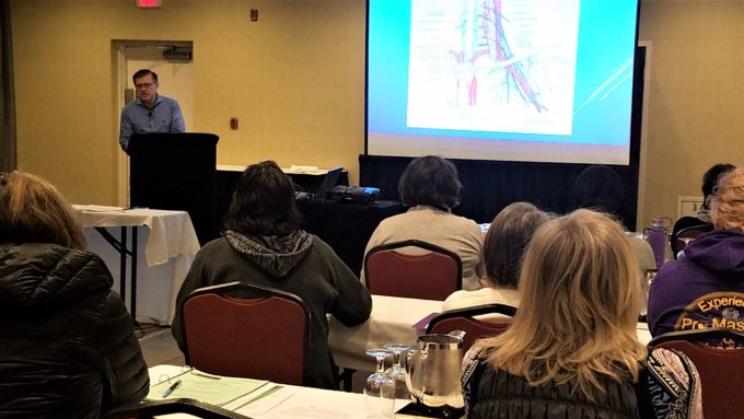Our keynote speaker, David Lesondak, taught for the rest of the day, beginning with his lecture entitled, “Smart Phone, Dumb Biomechanics.” Mr. Lesondak is the author of the book Fascia: What It Is and Why It Matters. Since the vast majority of people now use computers and smart phones extensively, they regularly develop musculoskeletal/myofascial pain associated with postural deviations during usage. We learned about the fascia’s role as a tissue and as a sensory feedback system, and also how to use fascia-focused palpation and manual therapeutic techniques to release dysfunctional tissue and movement patterns. Areas addressed included the anterior calf, sacrotuberious ligament, quadratus lumborum, pectoralis minor, scalenes, suboccipitals, and muscles of the forearm.