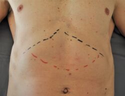After all treatment options were exhausted, she asked if MM could offer any relief. After examination, we found that the reflex zones (according to Glezer/Dalicho zones) associated with chronic gastric disorders were active in the left middle back fascia and the erectors. There was also tension in the anterior abdominal wall, which was more prominent along the left side. Most likely, this occurred as a protective reflex signaled by the brain in reaction to the stomach’s chronic inflammation. Fig. 1. illustrates Glezer/Dalicho Zones for gastric disorders.