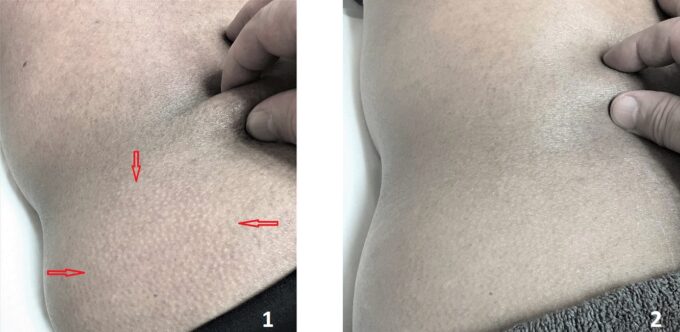 Picture 1 illustrates the application of the second part of Dr. Kibler’s Technique in his left lower back to examine the degree of tension in his superficial fascia. Every time we tried to lift a fold of skin on the patient’s lower back, goosebumps appeared on the skin in his left gluteal area (red arrows), the intensity of lower back pain sharply increased, and he felt warm wave spread down his left lower extremity. As soon as the skinfold was released (picture 2), the goosebumps diminished or went away entirely while the warm wave stopped. When we reapplied Dr. Kibler’s Technique, everything returned.