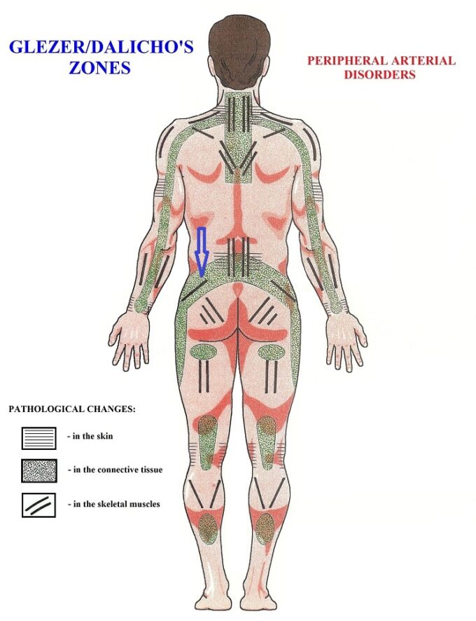 The final piece of the puzzle. Why did the patient feel warm sensations along the left lower extremity during the execution of Kibler’s Technique? The answer to this question is in the unmatching clinical value of Dr. Glezer/Dr. Dalicho maps of reflex zones. Please examine the Figure below, which presents the distribution of reflex zones in the soft tissues in cases of vascular abnormalities. The fascial tension (green dotted area emphasized by the blue arrow) spreads distally from the lower back along the lateral thighs, and it may trigger local vasoconstriction downward.