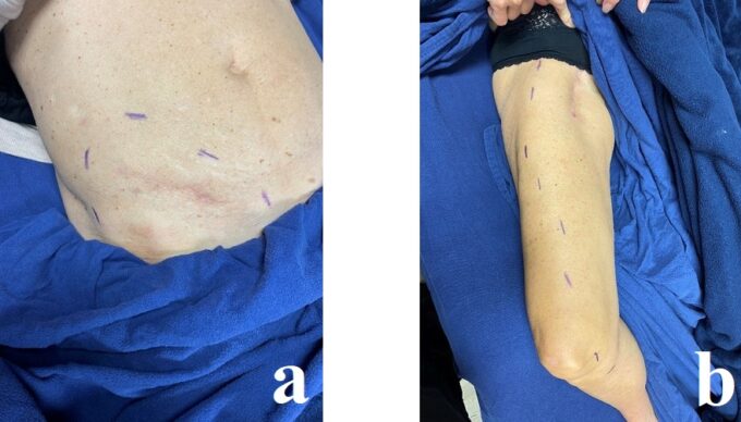 a – Outer dotted line indicates where the patient felt almost full recovery of sensations; the vertical line on the anterior thigh indicates an area where the patient started to feel the return of some sensations; two diagonal lines on the medial thigh indicate an area where the patient was beginning to feel tingling instead of complete numbness.