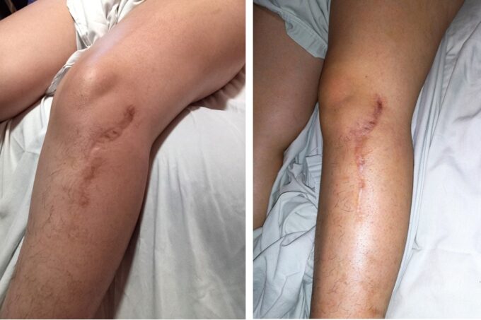 I worked the same protocol as the previous session. In the end, I showed her the before and after pictures of the scar tissue on her legs, suggesting that she return in two weeks when we could keep working on the scar tissue on the right side to see how much more improvement could be made. Pictures before illustrate the patient’s soft tissues and post-surgical scar before and after Medical Massage therapy. Originally, the leg was significantly swollen due to the original injury, postsurgical trauma of the soft tissues and lack of proper somatic rehabilitation.