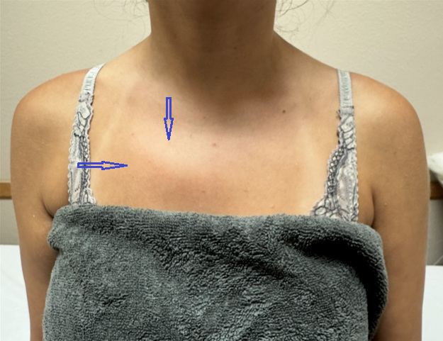Please compare the right and left parasternal areas, paying particular attention to the right side of her upper chest. There is a visual bulge in her right parasternal region (indicated by blue arrows in the photo).