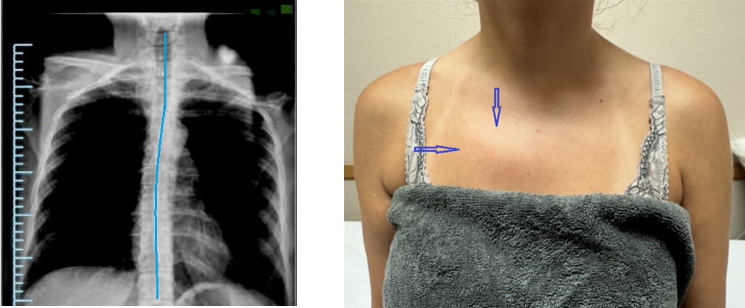 Thus, the patient’s anterior chest suggests the possible presence of an early stage of Scoliosis with thoracic curvature directed to the right.