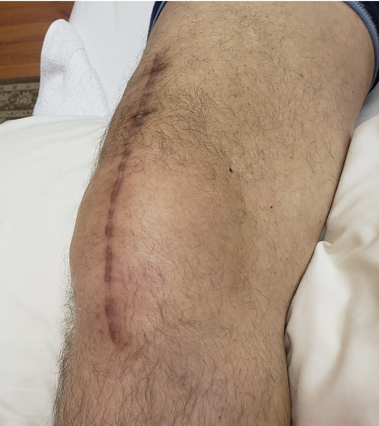 When he arrived, two things immediately caught my attention. First, the length of his surgical scar was highly unusual for a knee replacement—almost twice the typical length. Second, there was a complete lack of knee joint mobility (Fig. 1).